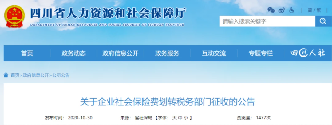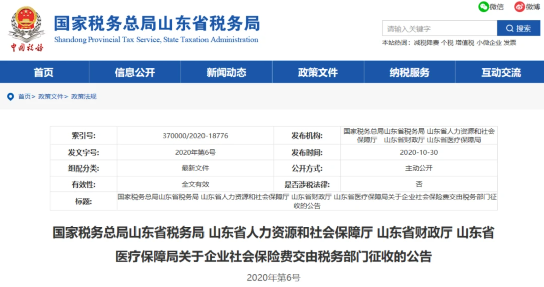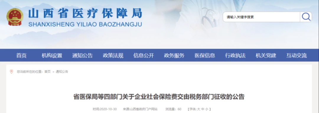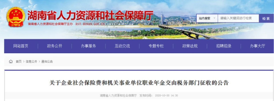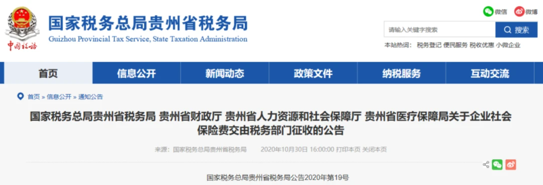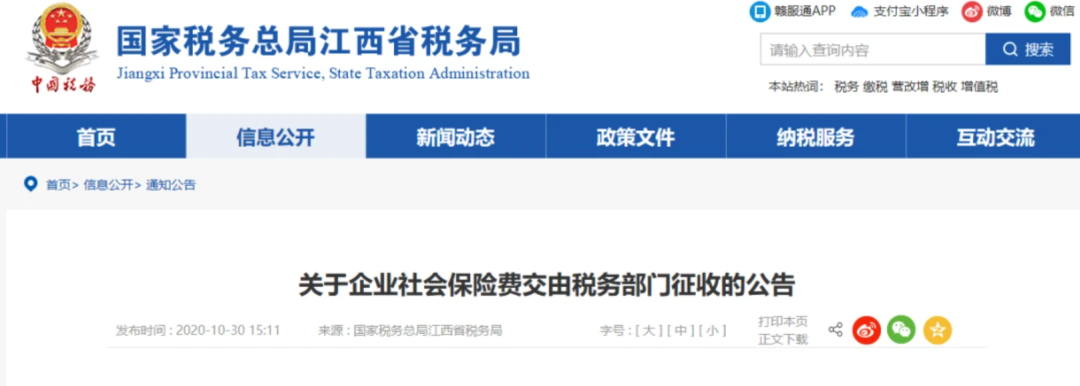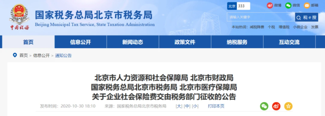 10月30日 北京、上海、山東、山西、湖南、四川、貴州、吉林、江西等地同時發布了《關于企業社會保險費交由稅務部門征收的公告》的通知。