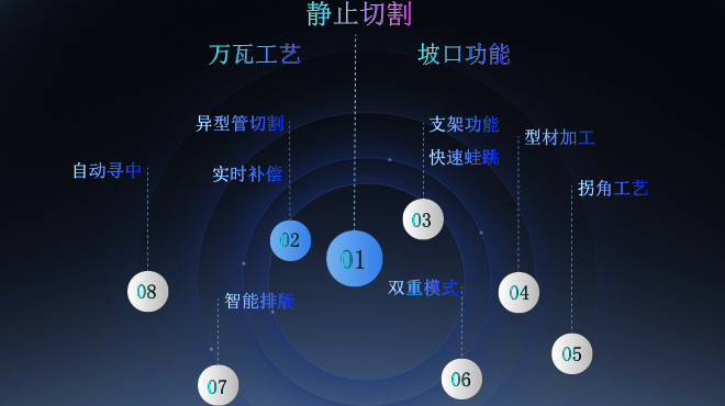 自動排樣、焊縫補償、模擬切割、微連,預穿孔,自動調焦